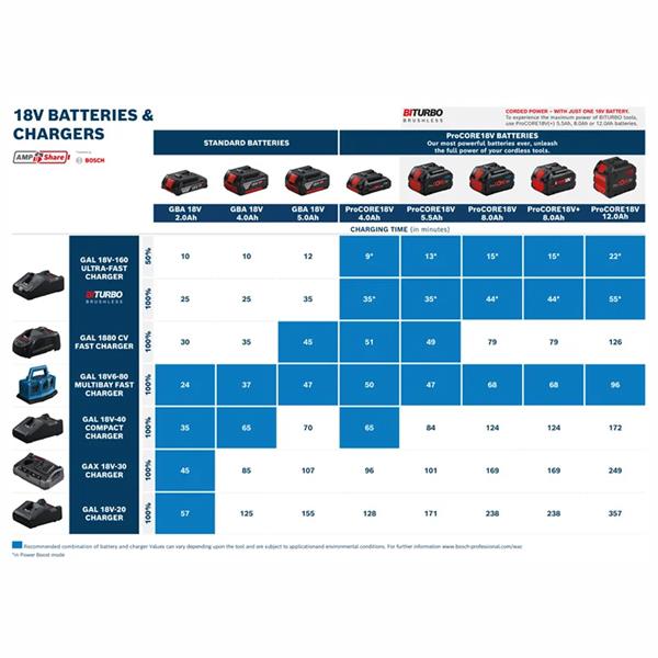 • Charg. time ProCORE18V 12.0 Ah (80%/100%) approx.*: 162/172 min
