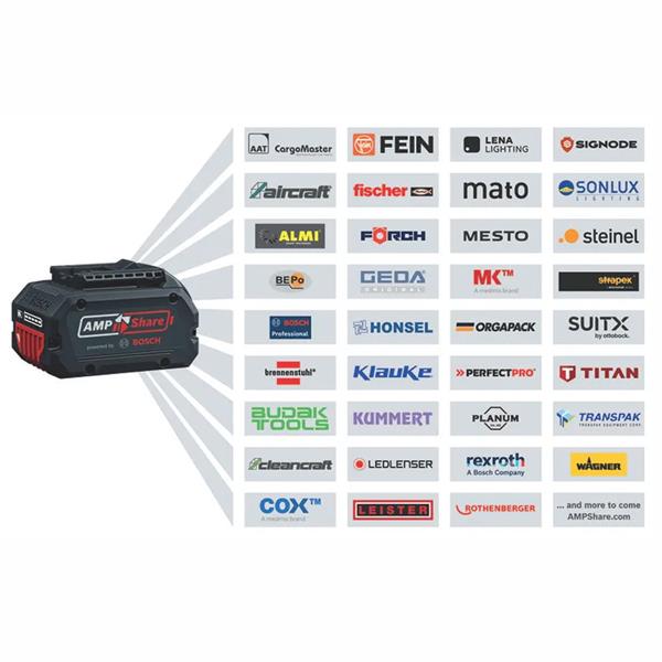 • Compatible with all batteries of the Bosch Professional 18V System and the AMPShare Alliance.