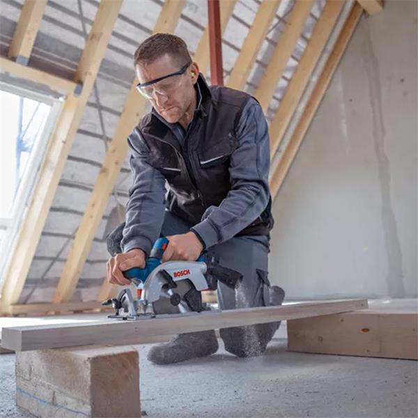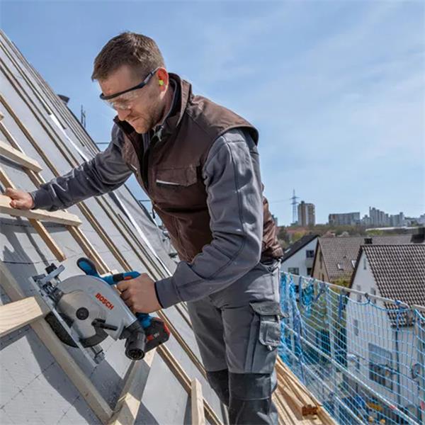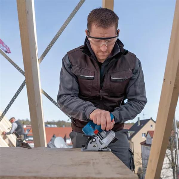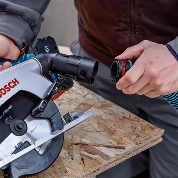 • The compact sized GKS 18V 57-2 L Professional cordless circular saw – with its saw blade on the left – delivers impressive performance thanks to its powerful brushless motor. The 165mm saw blade allows a cutting depth of 57mm in 90° cuts and is optimized for cordless working which ensures both, a fast cutting progress and maximized battery runtime. It features a 360° rotatable dust port connector, which is compatible with the Click & Clean System. This supports high dust-extraction efficiency and ensures an increased user health protection.