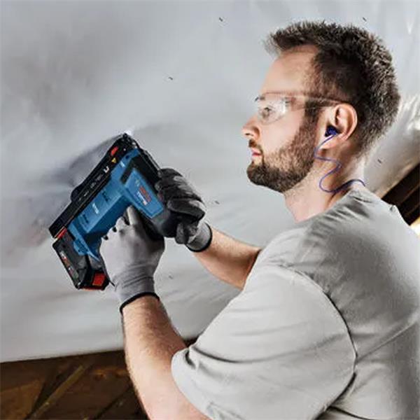 The GTH 18V-14 wood stapler ensures fast work progress thanks to the Bosch 18V brushless motor. This stapler makes work less tiring with the counterbalance system which reduces recoil. And you can depend on consistent staple sinking without the insulation material ripping thanks to its reliable depth adjustment. Maintaining a consistent distance to the workpiece is easy with the large parallel contact surface and there’s an LED light that illuminates the working area