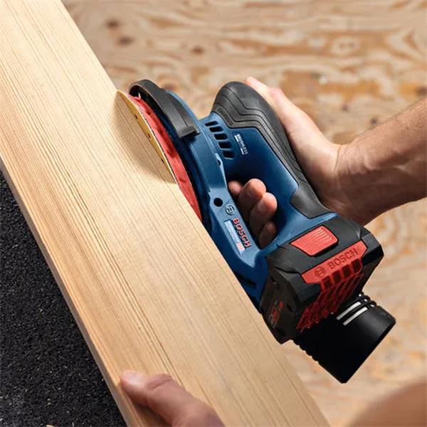 The GEX 18V-150-3 Professional random orbit sander’s outstanding balance and gripping area close to the workpiece offers optimal control in all working positions. Its excellent ergonomics make it easy to use with one or two hands for less-fatigue sanding over a longer period. This sander is extremely efficient with high removal rates thanks to its brushless motor and 3 mm orbit. Plus, there’s significantly less dust with the pad’s integrated Venturi Air Channels and the innovative dust box with integrated Click&Clean interface. Thanks to the HMI, operation is very simple and intuitive.
