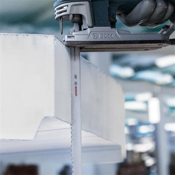 The PRO Metal Sandwich precise T1018AFP Jigsaw Blade owes its strength and flexibility to its Bi-Metal material: it has a high-speed steel (HSS) tooth strip bonded with a more elastic high-carbon steel (HCS). We made this blade thicker: it's hard to bend and delivers precise straight cuts at the angle you need. Its milled, wavy-set, and fine-pitched teeth will help you cut metal-sandwich panels neatly, with ease. The blade's extended length allows you to tackle workpieces up to 150 mm thick. We recommend using it with Bosch GST 150 and 160 jigsaws.