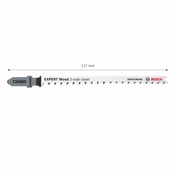 • With its extra sharp precision-ground teeth, the Bosch EXPERT Wood 2-side clean Jigsaw Blade is well suited to cutting softwoods up to 50mm thick. Cabinet makers can get a perfect finish and not lose time sanding after every jigsaw cut. Available for straight cuts (T308B), for curve cuts (T308BO) and for accurate angle cuts (T308BP).