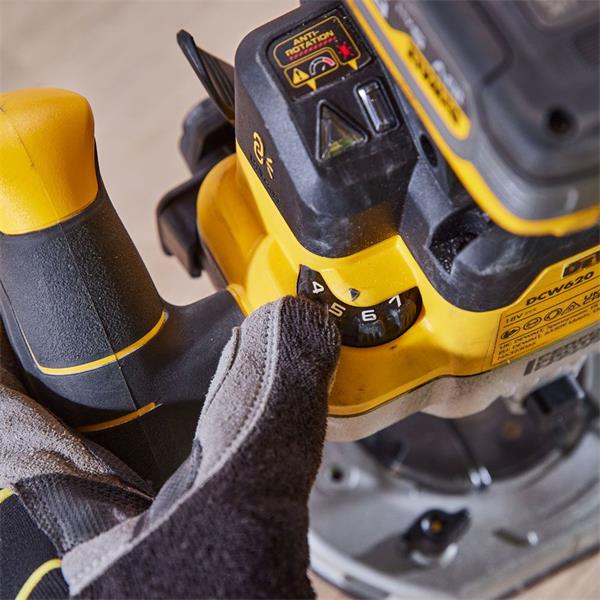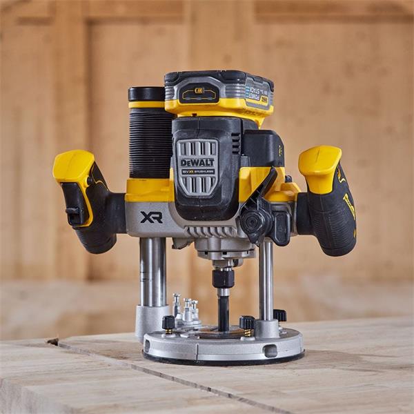 DeWalt's first 18V XR Brushless cordless 1700W dedicated plunge router delivers consistent cutting performance without the hassles of a cord. From meticulous edgework to aggressive plunge cuts, the 18V XR® Plunge Router features a 1700W horsepower brushless motor that seamlessly handles bits up to 63mm in diameter. The variable speed dial helps maximize user control while maintaining constant speed under load.