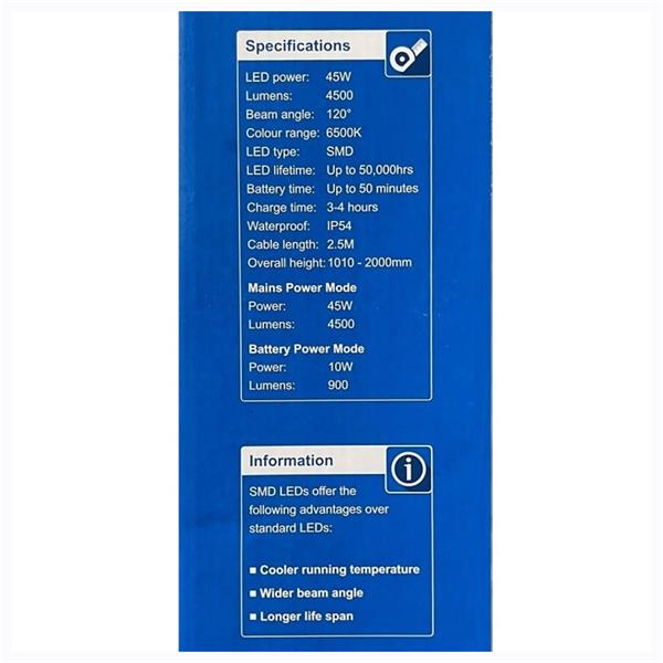 • It can be powered by mains or via the built-in lithium battery which allows for 50 minutes of 900 lumen lighting.