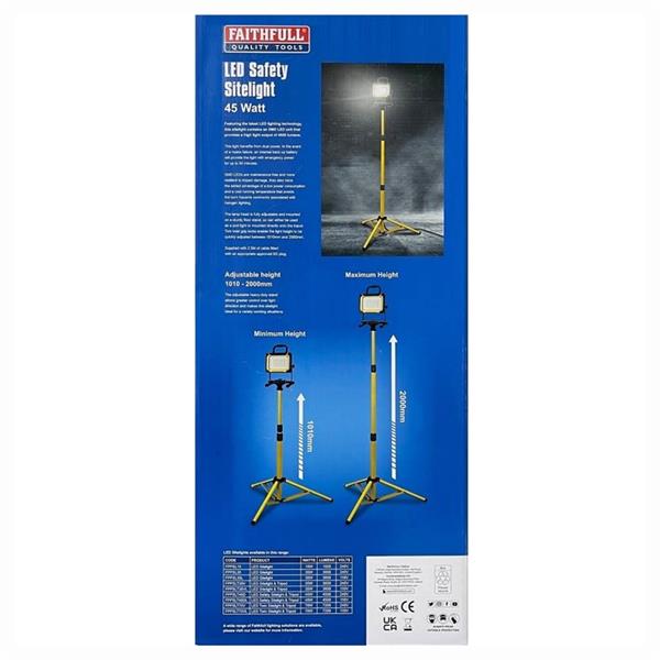 • The Faithfull Tripod Safety Site light is designed for both commercial or domestic use, and features the latest SMD LED lighting technology. The LED site light avoids the burn hazards commonly associated with halogen lighting. Unlike conventional halogen tubes, SMD LEDs are maintenance free and more resilient to damage.
