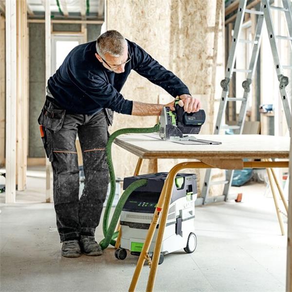 Goodbye dust. And hello good health – even without an electrical outlet module. The CTMC MIDI cordless compact dust extractor loves dust and is perfectly coordinated to your Festool cordless tools. Whether for mobile sawing, sanding or drilling applications: Its compact design and low weight make it the perfect partner for your daily work. This allows you to work in a dust-free environment even with a battery system. The innovative Bluetooth® autostart or the practical remote control ensures the perfect combination of the cordless tool and the extractor. Our cordless extractor excels with maximum suction power thanks to the 36 V turbine with 2 x 18 V battery packs. For healthier work in dust class M. And, just as usual, everything is compatible: The extractor, smooth suction hose, cordless tool, T-LOC Systainer connection. This makes the system perfect in every way.