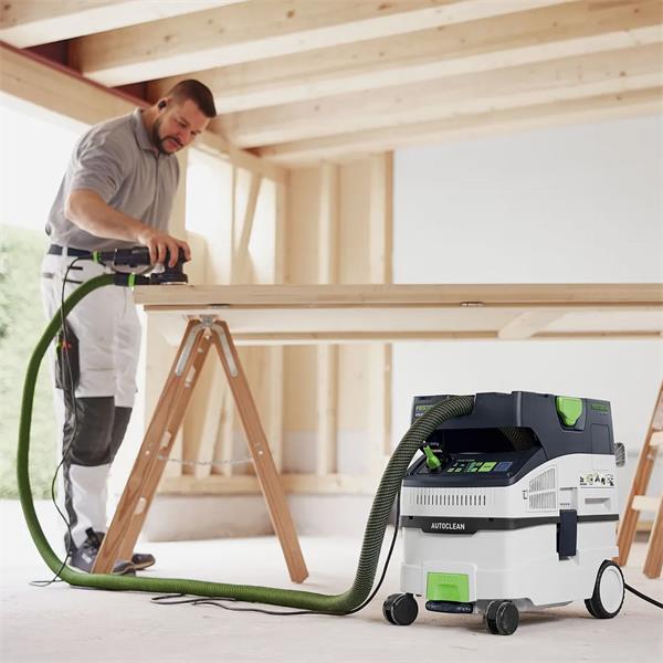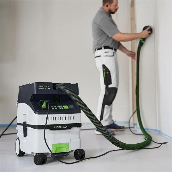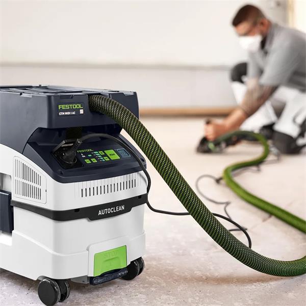 The CTM MIDI AC compact dust extractor boasts technically advanced AUTOCLEAN main filter cleaning. This keeps the filter clear and ensures consistently high suction power, longer working intervals and a longer filter service life with lower maintenance effort. Its low weight and compact dimensions make it ideal for service and installation work. With lots of innovative details, such as the smooth suction hose and touch operation. Integrated Bluetooth® technology starts the mobile dust extractor automatically via the Bluetooth® battery pack or the optional remote control. The internal hose holder, the Systainer T-LOC coupling and the practical cord holder ensure tidiness and speed.