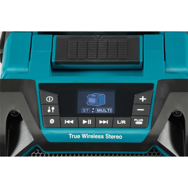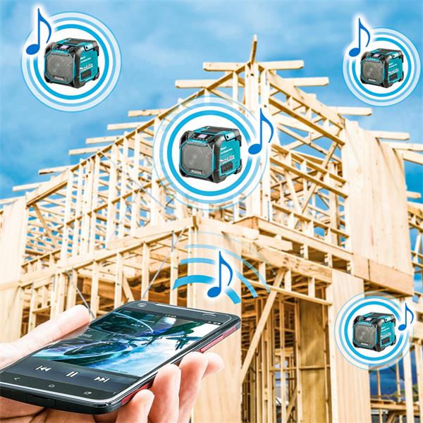 A rugged and durable construction site speaker with IP65 protection rating. Equipped with display and equalizer. Up to 10 speakers can be connected to one audio source. Works with CXT® and LXT® batteries or AC power. Bluetooth and AUX connectivity, plus a USB connector for charging your phone.