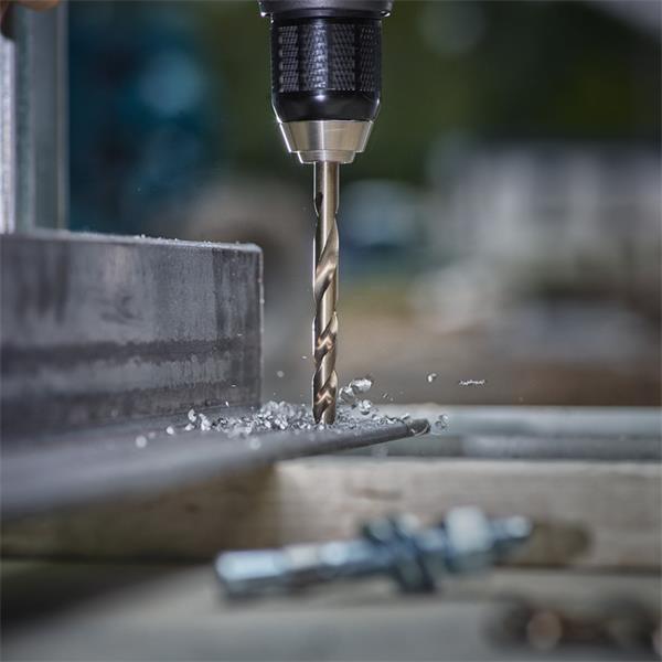 • Metal drill bits ground from solid, extremely heat resistant 5% cobalt-alloyed high speed steel produced according to DIN 338.